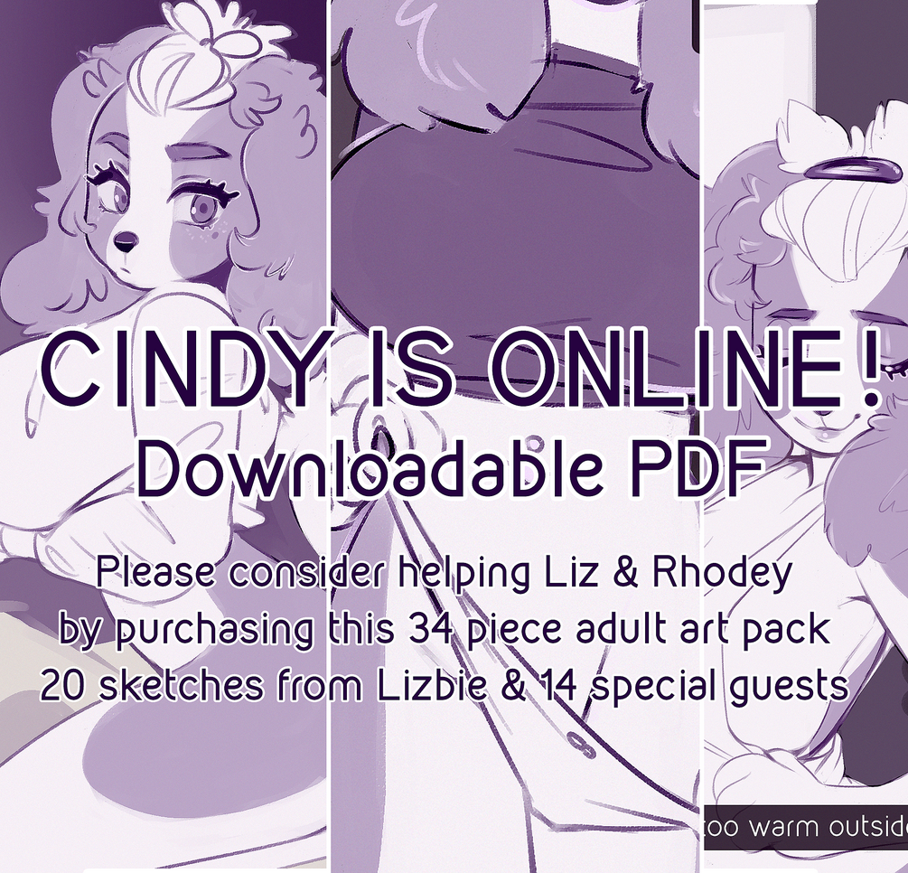 Cindy is Online! is a digital downloadable pdf file with 34 images of my wonderful internet model Cindy. 20 sketches done by Lizbie and 14 extras by special guests.